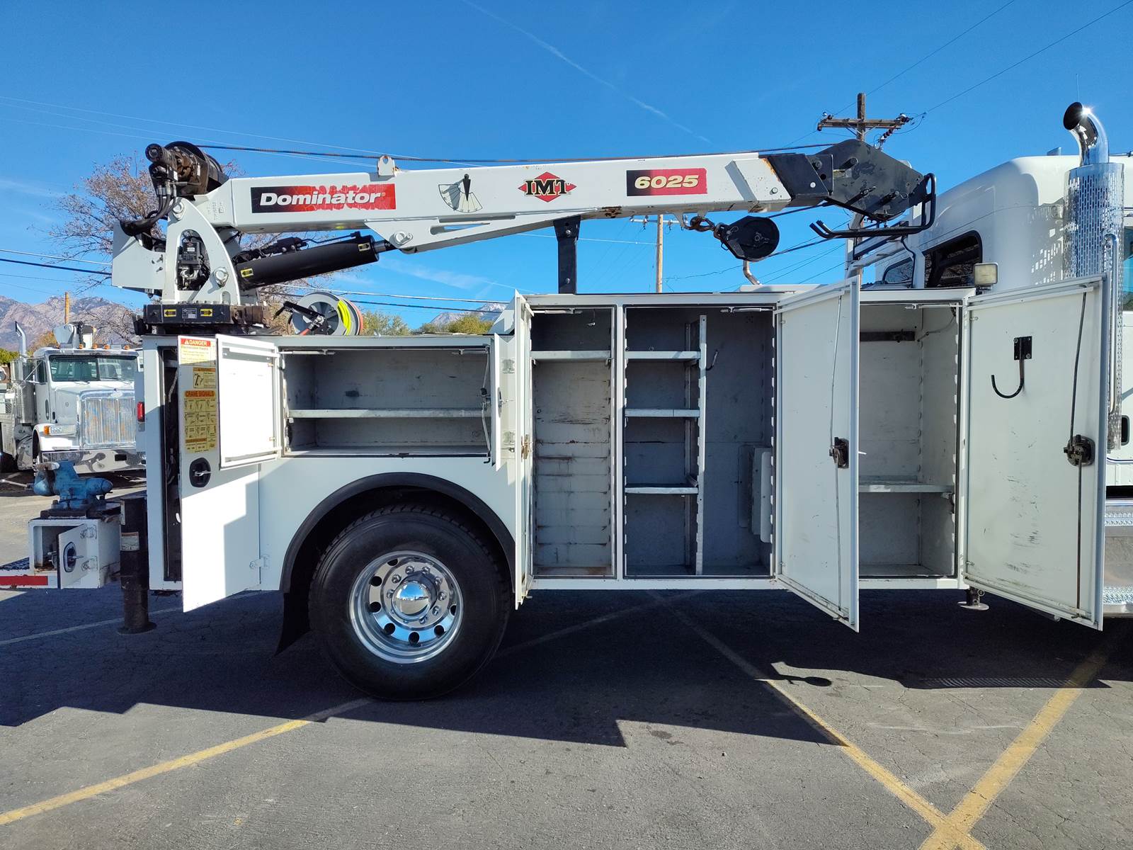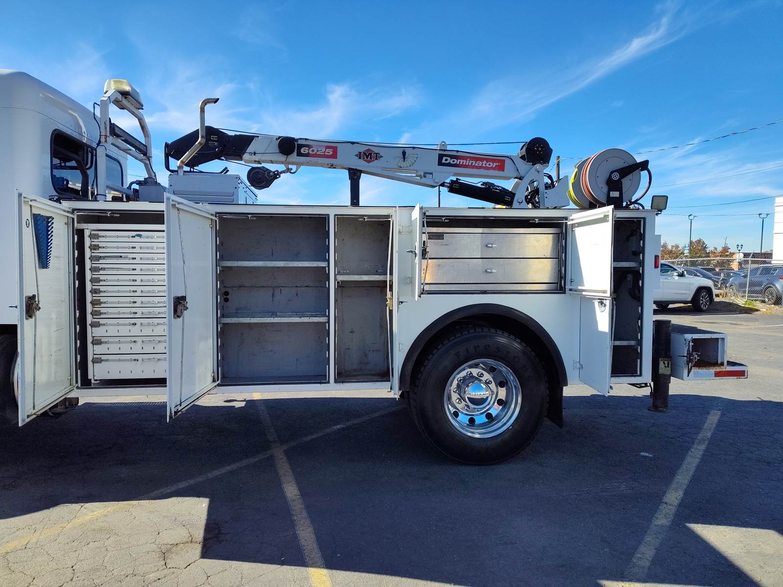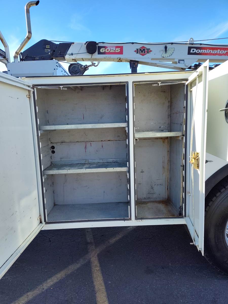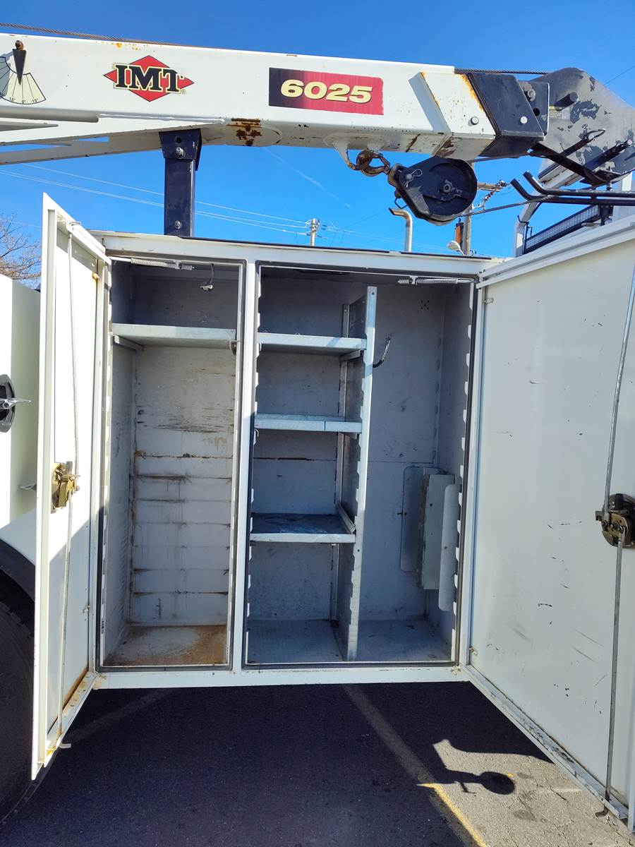 Mechanics Body Specs: 14' IMT Crane Work Body w/ Aluminum tread plate on front compartments, IMT 10,000 lbs. Crane and boom rest w/ wireless remote. Miller EnPak A60 Series (60 CFM / 175 PSI - Air Compressor), Generator 120/240 V in 15 Gal. per min., pump 8 per min. Diesel Kabota Engine / **Evac system / Hose reel, (2) Air reels, Hydraulic pump, (1) 48" Storage Compartments, 21" workbench bumper, 8" Wilton vise, Trailer hitch, Rear Tailgate, Shelving package, (1) 11 drawer set, (1) 2 draw set, black lining in bed and work bumper, (6) D-rings, Gang locks, Oxy/acct compartments, (2) Hydraulic outriggers.
