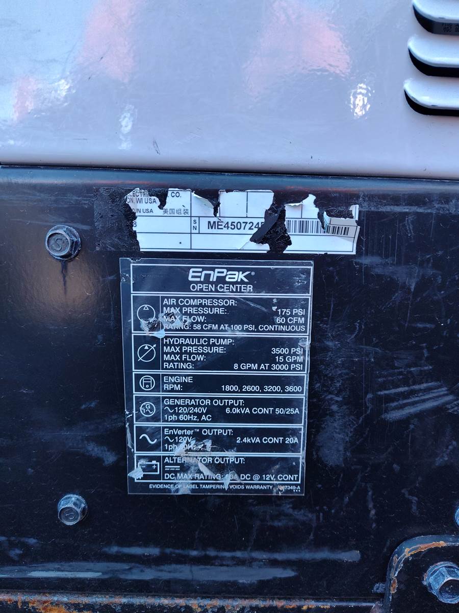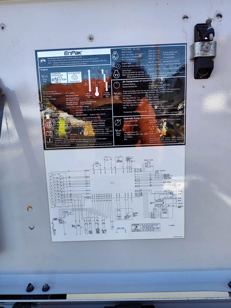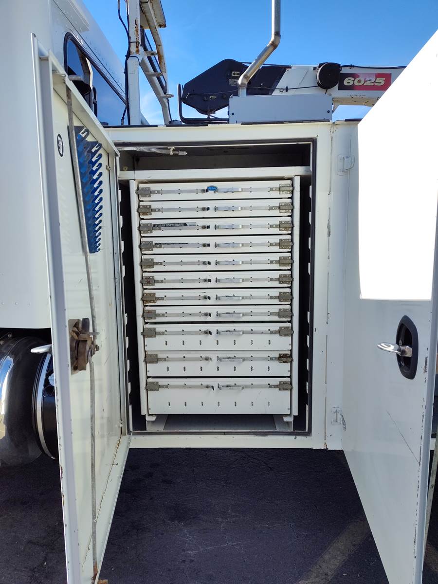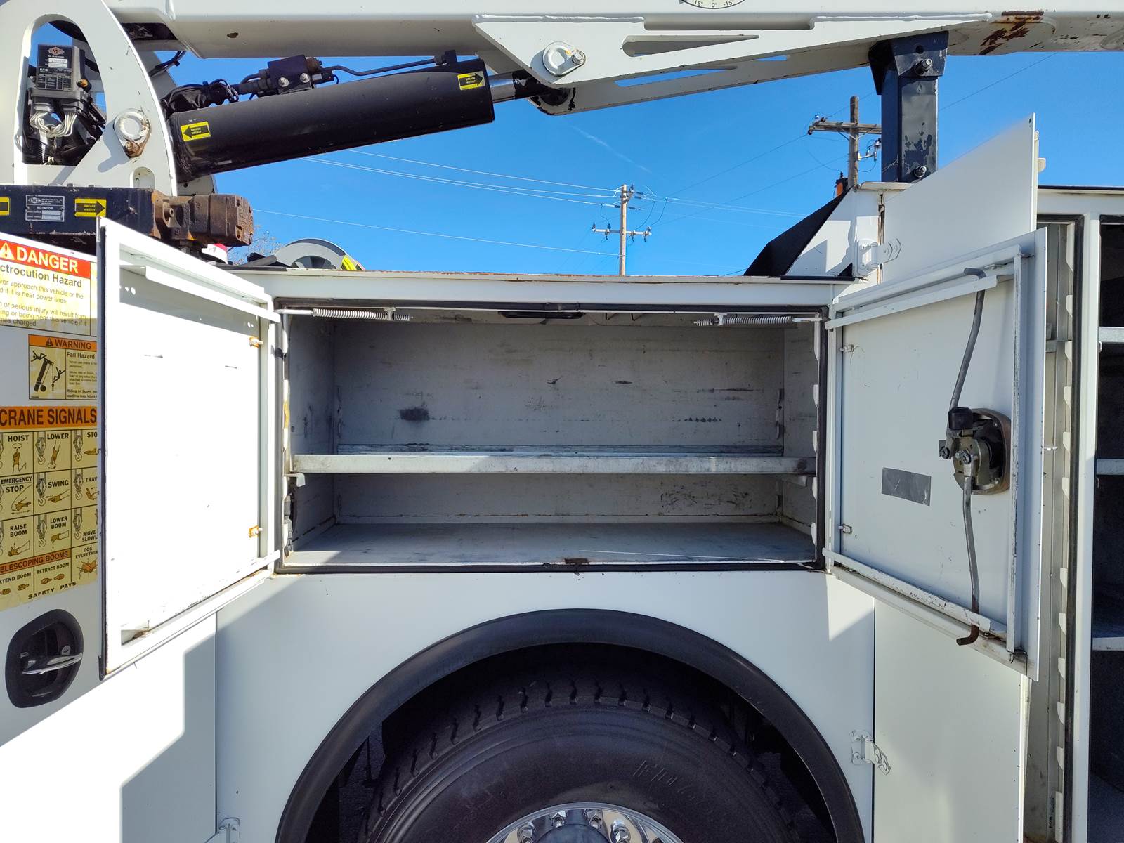 Mechanics Body Specs: 14' IMT Crane Work Body w/ Aluminum tread plate on front compartments, IMT 10,000 lbs. Crane and boom rest w/ wireless remote. Miller EnPak A60 Series (60 CFM / 175 PSI - Air Compressor), Generator 120/240 V in 15 Gal. per min., pump 8 per min. Diesel Kabota Engine / **Evac system / Hose reel, (2) Air reels, Hydraulic pump, (1) 48" Storage Compartments, 21" workbench bumper, 8" Wilton vise, Trailer hitch, Rear Tailgate, Shelving package, (1) 11 drawer set, (1) 2 draw set, black lining in bed and work bumper, (6) D-rings, Gang locks, Oxy/acct compartments, (2) Hydraulic outriggers.
