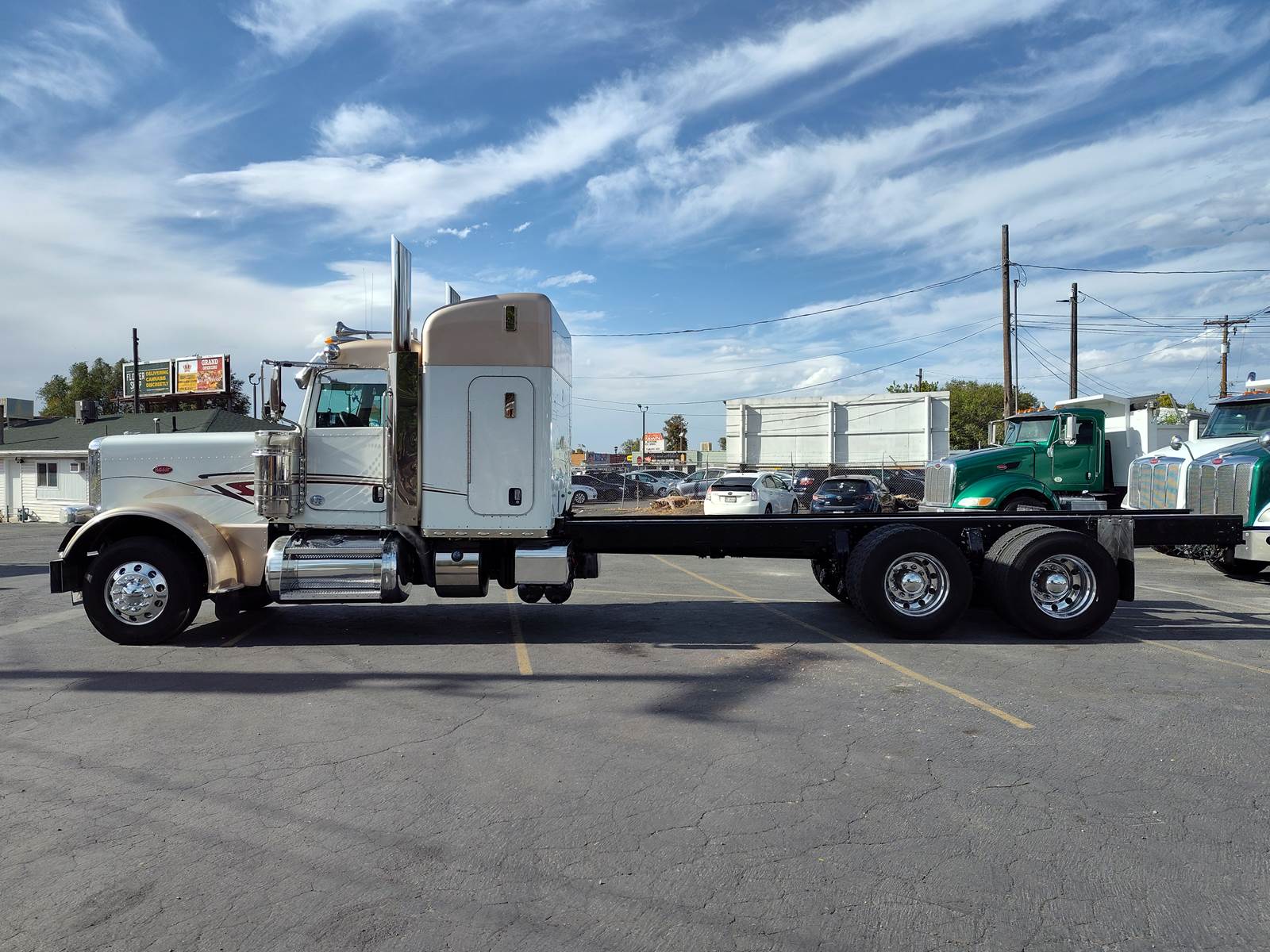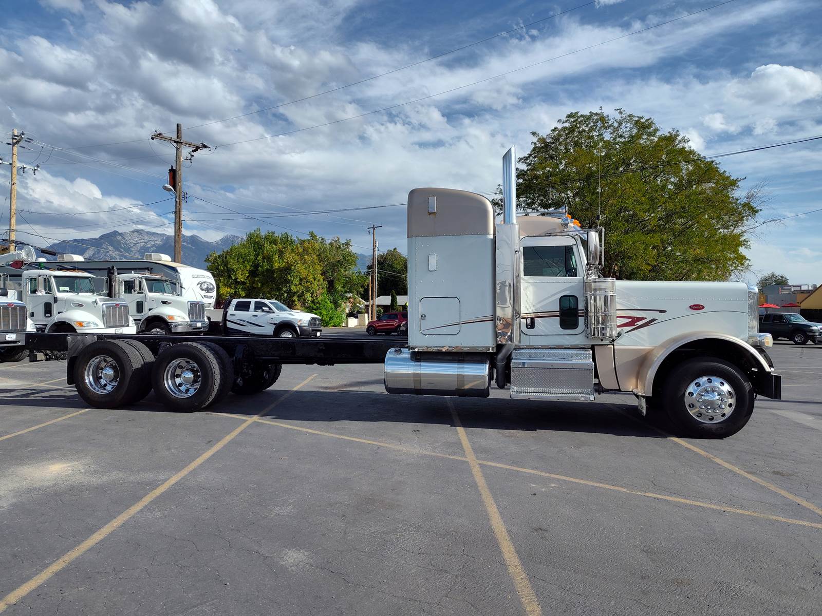 GREAT FIND! She's a bute tandem axle sleeper truck with an extended long hood. This 2015 Peterbilt 389 is equipped with a Cummins ISX 15-liter, 550 HP, Eaton Fuller 18-speed manual transmission. Grab handles, West Coast Mirrors with convex, AM/FM/CD/Navigation w/ Full-Screen & Stereo, Bluetooth, Navigation Touch Screen, CB Radio, Bose Luxury Driver's Air-Ride Seat with Armrests, Comfortable Passenger Seat, Overhead compartments, Floor Mats, Door Pockets, Full Lockers, 3-Stage Jake Brake, Cruise Control, Sight window in door, Dual Breathers, Dual Stacks. Air-ride seats, Power lock/windows/mirrors, Power steering, Heated mirrors, Curtains, bench for bed, compartments for storage in sleeper, Parking brake, Diff-locks, Cab marker lights, Bezeled front lights, Chrome mesh grill, Chrome bumper, Dual Breathers, Dual Stacks, Custom paint and stripping, all the bells and whistles. Air-leaf suspension, 13,500 lb. Front axle, 46,000 lb. Rear axle, Double framed