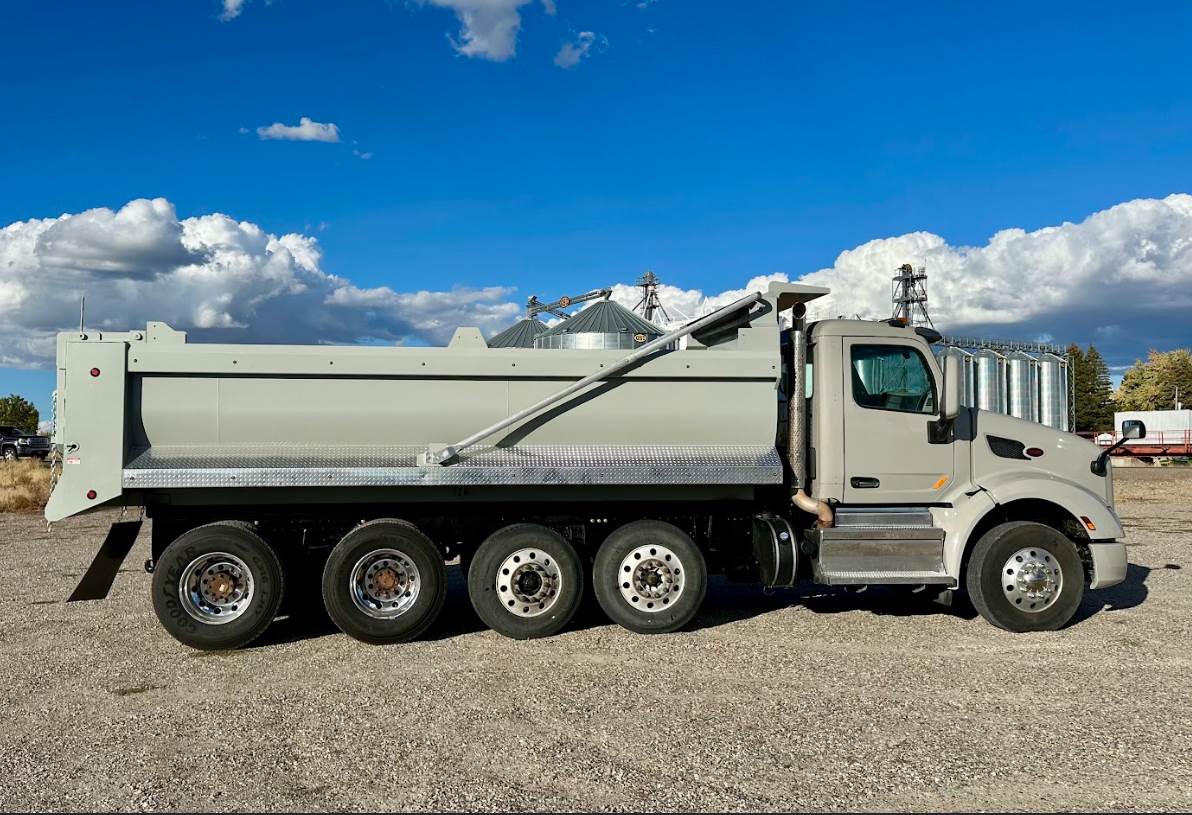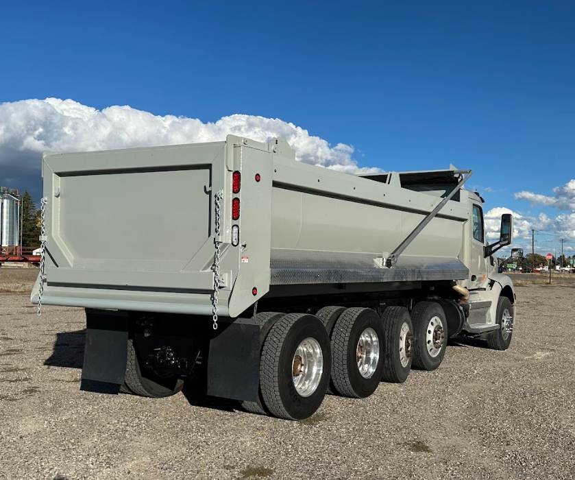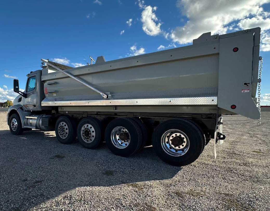 *2019 Peterbilt 567 Quad Axle Dump truck equipped with a Cummins ISX 15, 15 ltr., 500 HP, Eaton Fuller (Endurant Transmission) with 12- Automatic. Features: Grab handles, Chrome Sun Visor, Chrome Grill, Work floors, Bose driver's Air-ride seat, Comfortable passenger, Power Windows/Locks/Heated Mirrors, Power Steering, AM/FM/AUX - 12 V plugs, Bluetooth radio, DPF/DEF, Leaf-Air Suspenion, Diff-Locks, Rear Gear Ratio 4.11, Parking brake, Jake Brake, Dump Body Controls - In CAB, Interior Sun Visors. Air-horn, Cab marker lights, Right-hand vertical stack, Aluminum Steps, Aluminum Diesel Fuel 90 Gallons, Air-brakes all around, Tires Like NEW (95%), Front Axle 16,000 lbs Front Spring, (2) Lift Axles 13,500 lbs each, H.D. Chalmers Suspension, Rear Tandem Axles 46,000 lbs. Usage 553k, Hours, 11,851. Butt Plate includes: 7 Way Electrical and Pintal Hook, & Airlines.