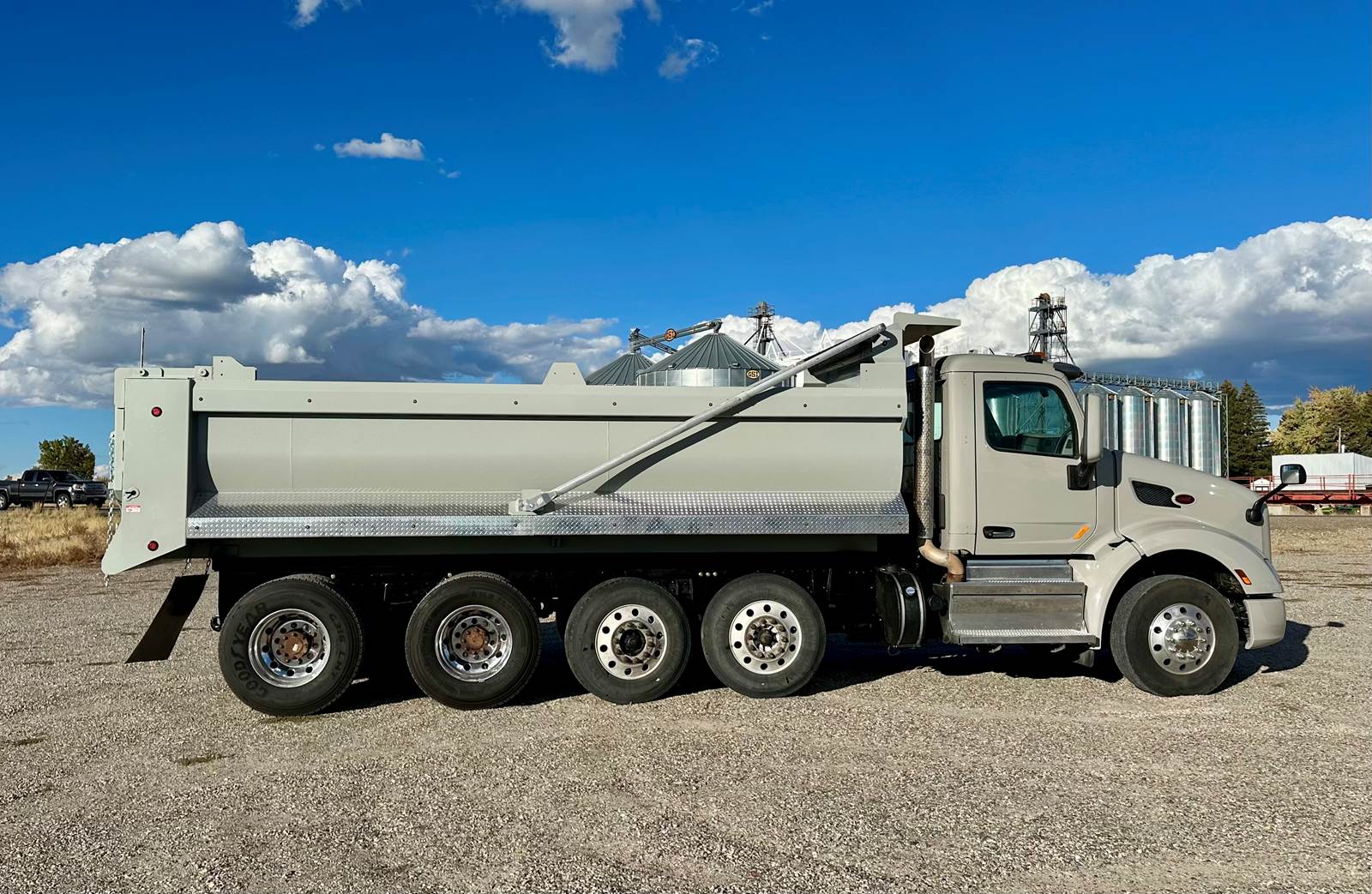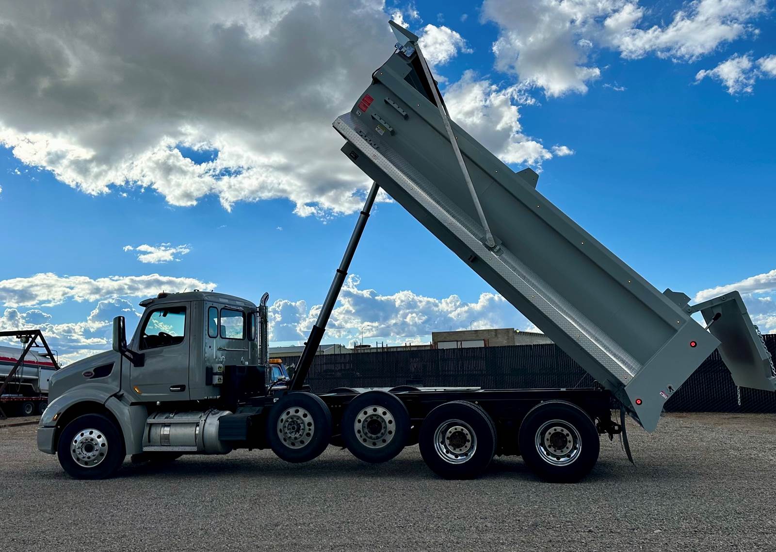 NEW DUMP BODY HARDOX 450 w/ wear plate (Sides, Floor, Tail gate), NEW Frame - Steel reinforced for dump body, AMTEX Industry White Eliptical Dump Body, Subframe ***4X4"X3/16" Square Tubing, 1' Shorter than body length, with hinge system and multi-stage hydraulic cylander attached. Safety Features*** Ladder on driver's side, Full Fenrs, Tailgate System, Dual Gate System (High Lift / Conventional Operation), Lighting ***DOT - LED (4 RED tail/ brake/turn), (2) white reverse, & Clearance lights), Finish *** Powder Coat Primer and Light Grey Custom Paint on cab and dump body), Tarping System***Electrical Swing Arm a/ H.D. Mesh Tarp (Electrical Motor, Aluminum Arms, H.D. Electrical Cable and Switch), Cab Protector*** Set at 80" Clearance X 72" W for Double Stack.