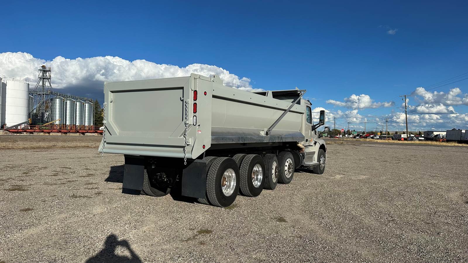 *2019 Peterbilt 567 Quad Axle Dump truck equipped with a Cummins ISX 15, 15 ltr., 500 HP, Eaton Fuller (Endurant Transmission) with 10- Automatic. Features: Grab handles, Chrome Sun Visor, Chrome Grill, Work floors, Bose driver's Air-ride seat, Comfortable passenger, Power Windows/Locks/Heated Mirrors, Power Steering, AM/FM/AUX - 12 V plugs, Bluetooth radio, DPF/DEF, Leaf-Air Suspenion, Diff-Locks, Rear Gear Ratio 4.11, Parking brake, Jake Brake, Dump Body Controls - In CAB, Interior Sun Visors. Air-horn, Cab marker lights, Right-hand vertical stack, Aluminum Steps, Aluminum Diesel Fuel 90 Gallons, Air-brakes all around, Tires Like NEW (95%), Front Axle 16,000 lbs Front Spring, (2) Lift Axles 13,500 lbs each, H.D. Chalmers Suspension, Rear Tandem Axles 46,000 lbs. Usage 553k, Hours, 11,851. Butt Plate includes: 7 Way Electrical and Pintal Hook, & Airlines.